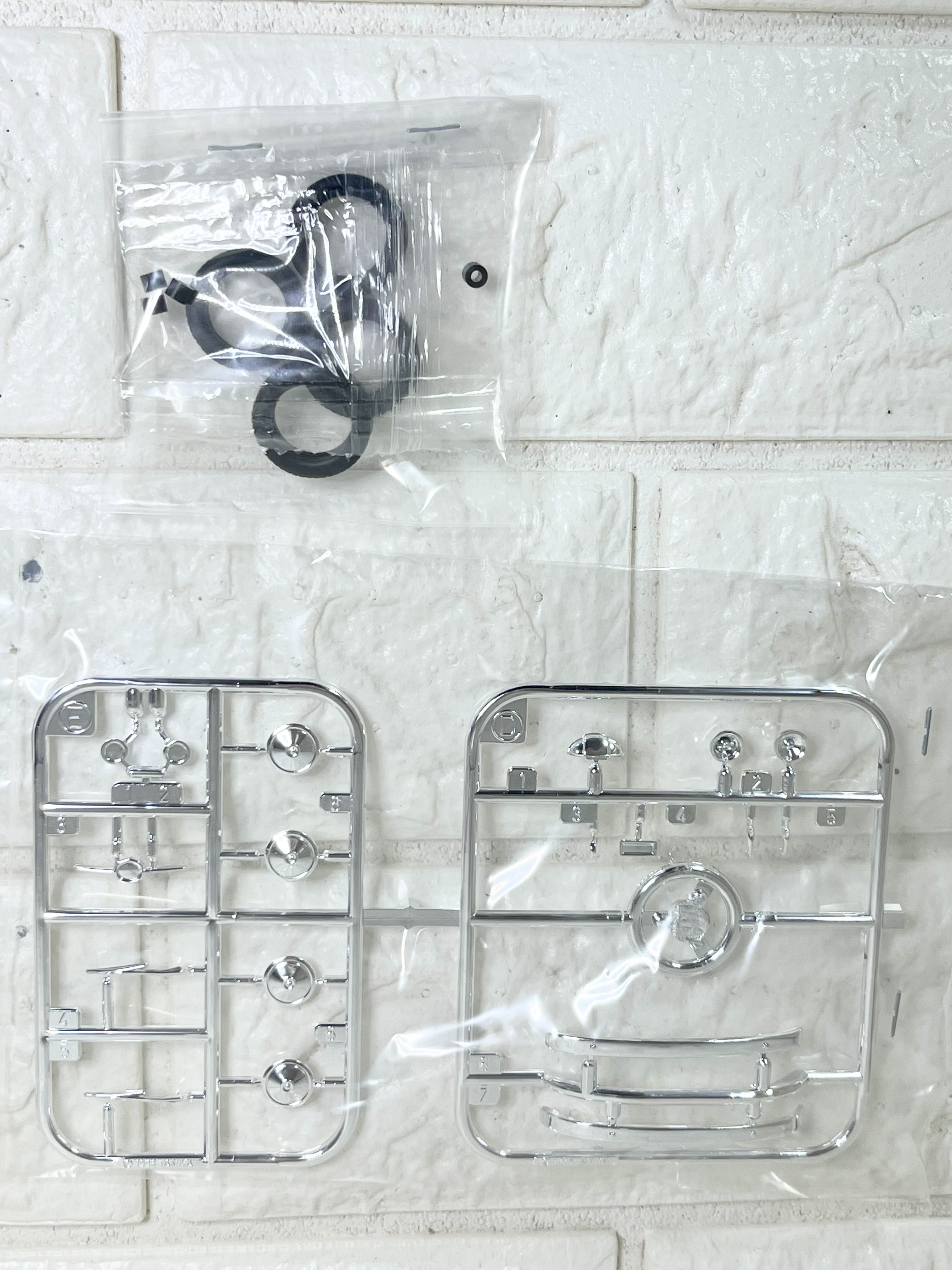 실버 느낌을 위한 코팅 파츠, 유리창과 타이어 재현을 위한 고무 부품.