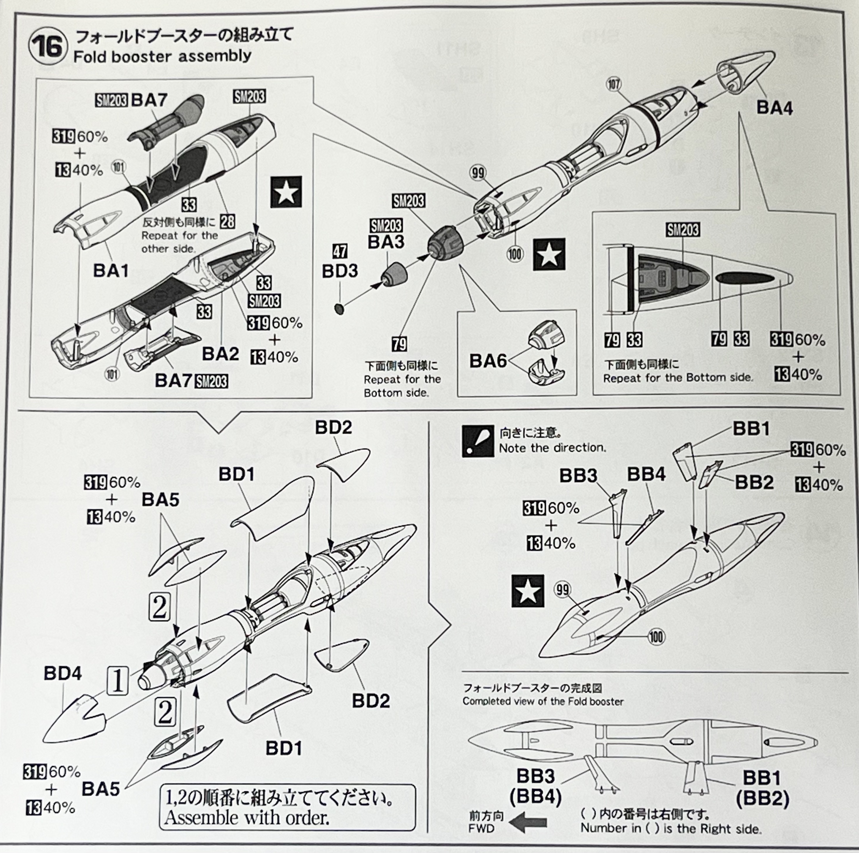 색상 지정은 꽤 복잡하게 되어있는 편인데 만들다 보면 꽤 재미있을 것 같은 구조입니다. 색분할 사출이 아니니까 반다이 프라모델처럼 조립하고 끼우면 끝나는 것은 아니고 색상을 맞춰 차근차근 도색해주어야 합니다. ( 폴드 부스터는 마치 만화가 '미츠모토 레이지'의 메카 디자인을 생각나게 만들기 때문에 꽤 좋아합니다. ^^ )