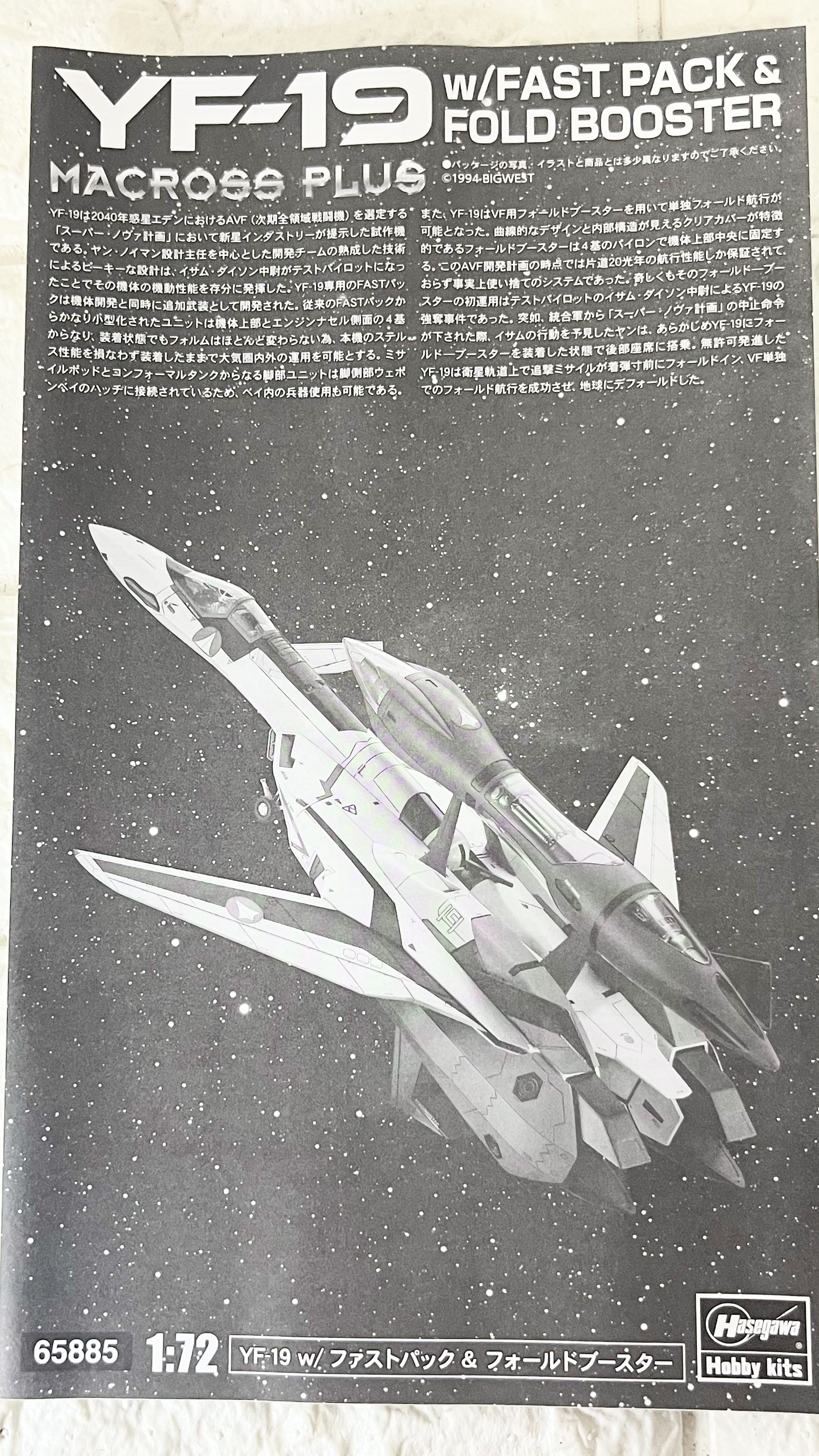 오늘 소개힐 프라모델은 모형회사 하세가와에서 애니메이션 마크로스 시리즈의 저작권 대행 회사인 빅웨스트로부터 라이센스를 취득해 제작, 판매하고 있는 < 1/72 스케일 YF-19 알파원( 엑스칼리버 ) With 패스트팩 & 폴드부스터 >입니다.