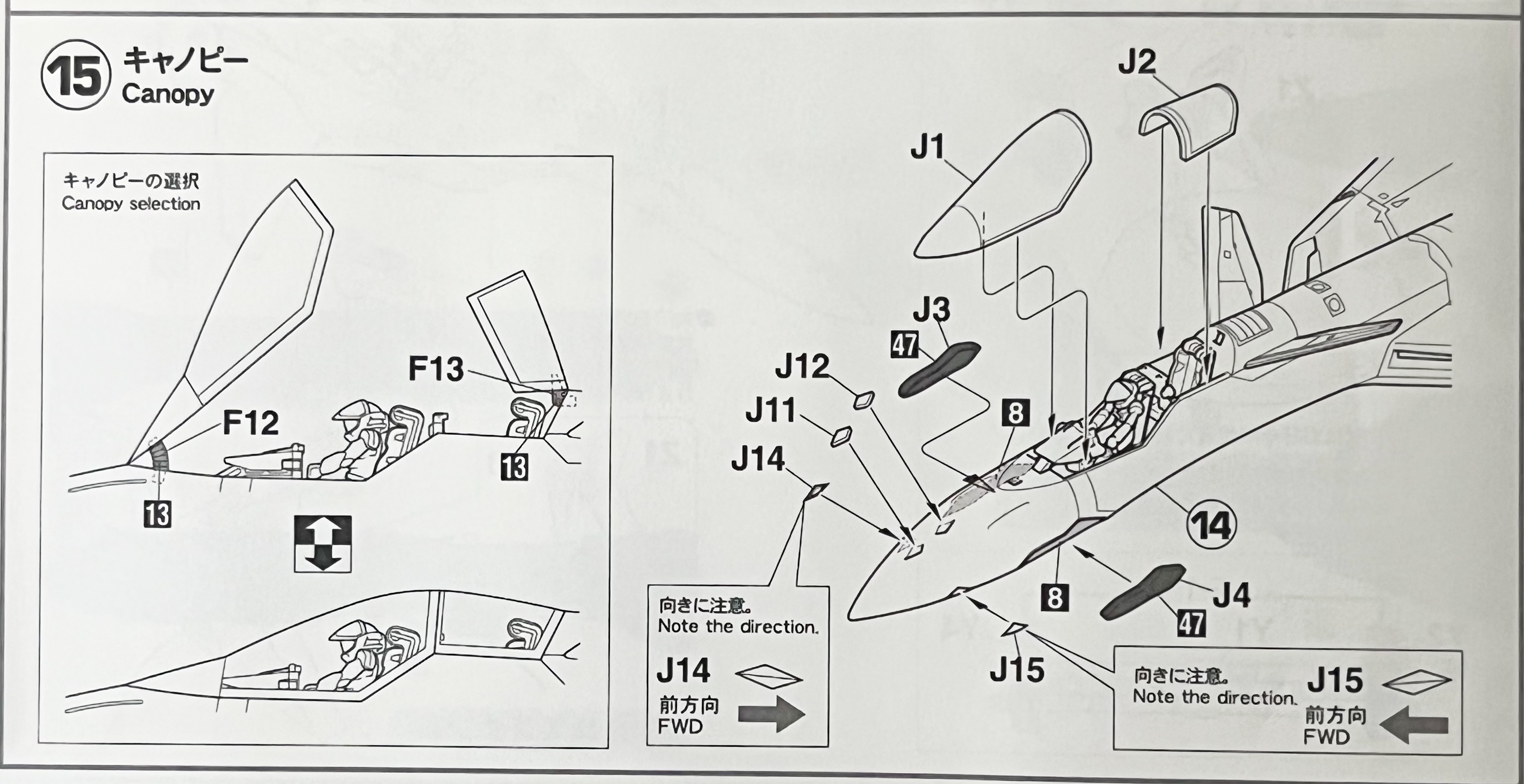 캐노피는 선택식으로 개방과 폐쇄 중 하나를 선택할 수 있는데 스케일 모형의 특성상 접착제를 사용해 붙이니까 한번 정하면 마음이 바뀌어도 변경할 수 없습니다. ( J14, J15부품은 조립 시 방향에 주의하라고 합니다. )