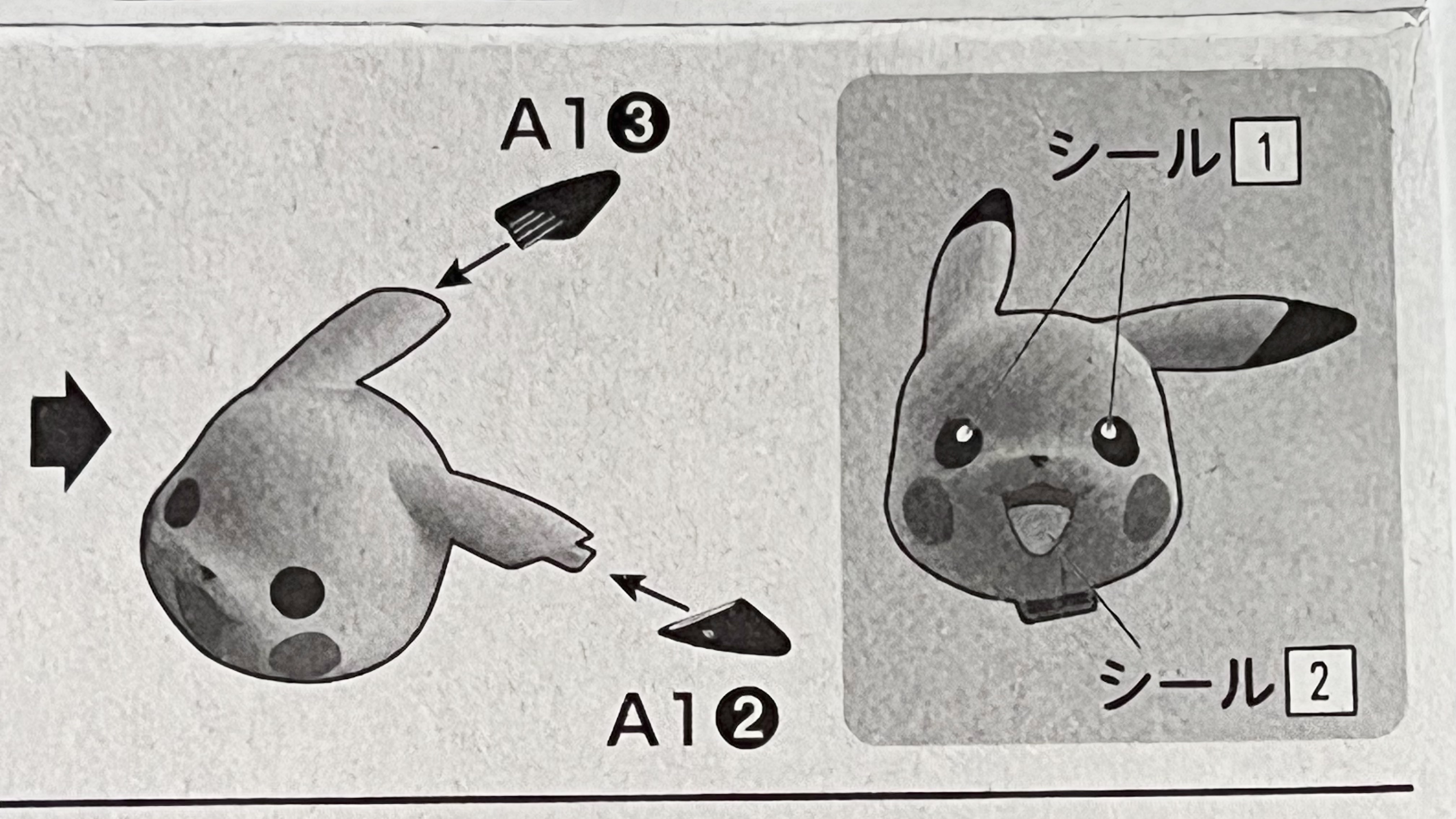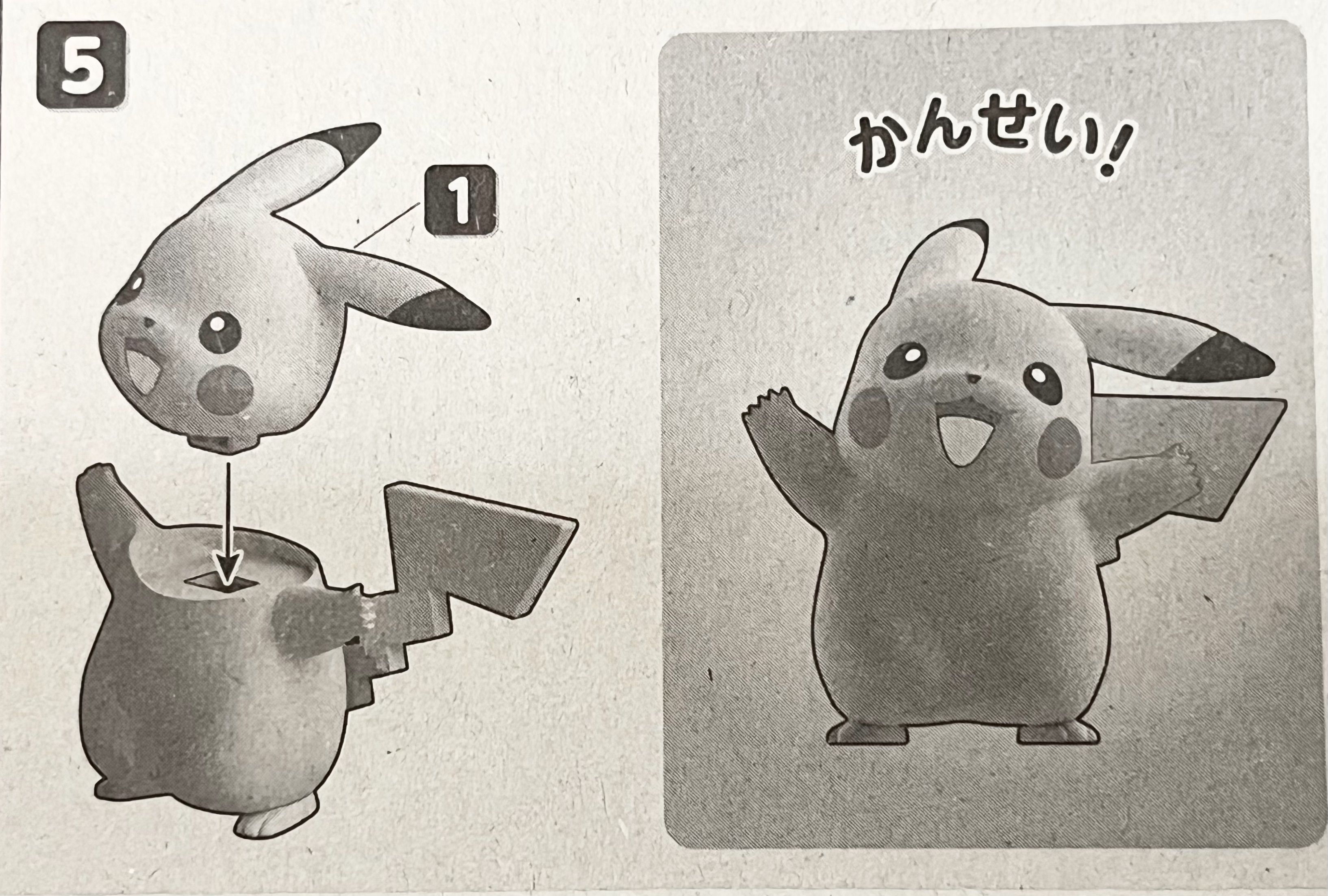 2 분할 파츠로 구성된 몸통을 결합하고 '피카츄'의 등줄무늬는 갈색으로 사출 된 플라스틱 부품을 결합해 재현합니다.